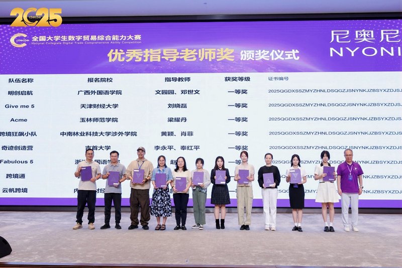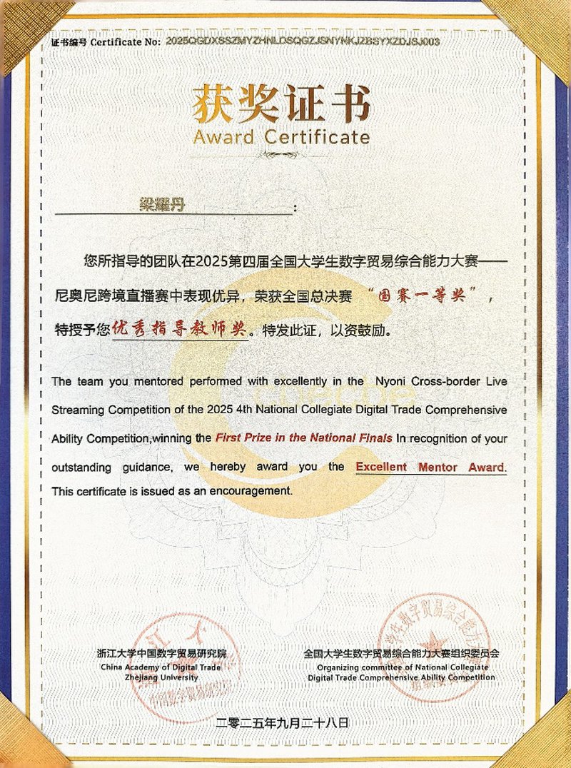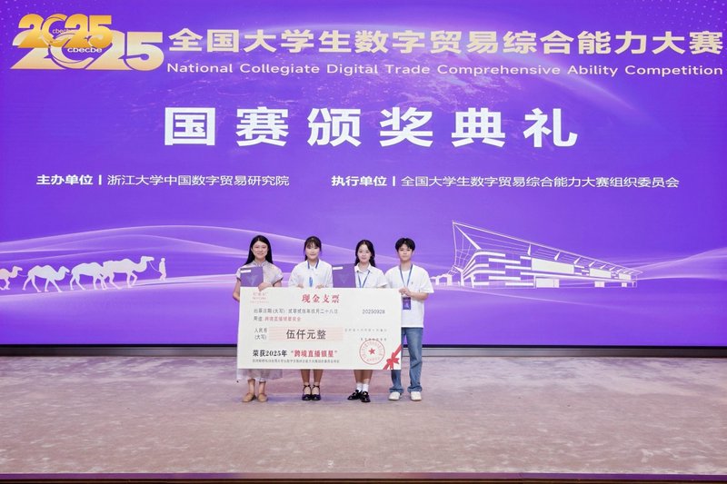2025年9月28日,第四届全国大学生数字贸易综合能力大赛颁奖典礼在浙江大学紫金港校区图书馆报告厅隆重举行。我校外国语学院学生首次参加尼奥尼跨境直播赛道便取得优异成绩,商务英语专业学生邓莹莹、尹悦、朱志铖组成的Acme团队以全国排名第三的成绩,荣获全国总决赛一等奖及“尼奥尼跨境直播银星”5000元现金奖励!梁耀丹老师荣获优秀指导老师奖!