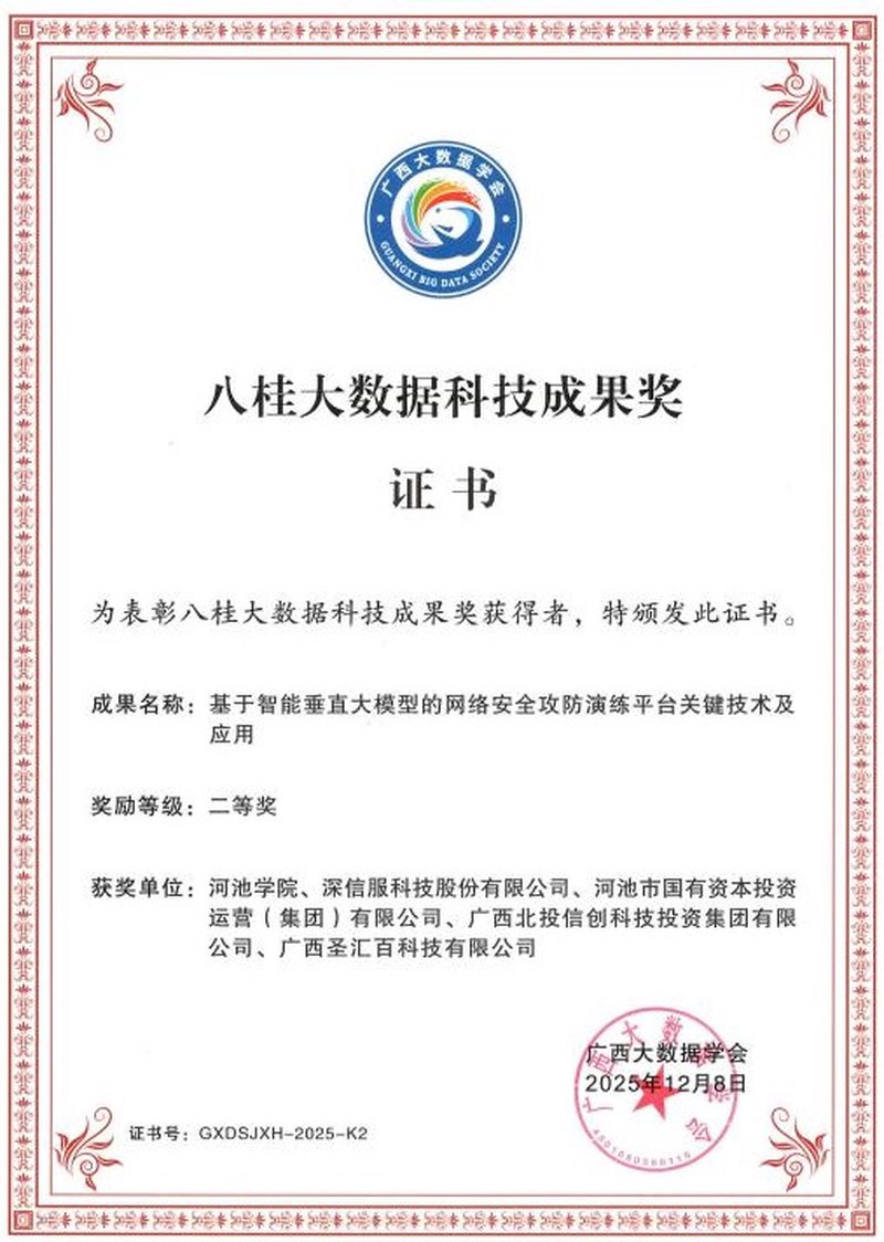 近日,2025年度八桂大数据科技成果奖评选结果揭晓,由我校联合深信服科技股份有限公司、河池市国有资本投资运营(集团)有限公司、广西北投信创科技投资集团有限公司、广西圣汇百科技有限公司等单位协同攻关完成的项目《基于智能垂直大模型的网络安全攻防演练平台关键技术及应用》,在众多参评项目中脱颖而出,荣获二等奖。